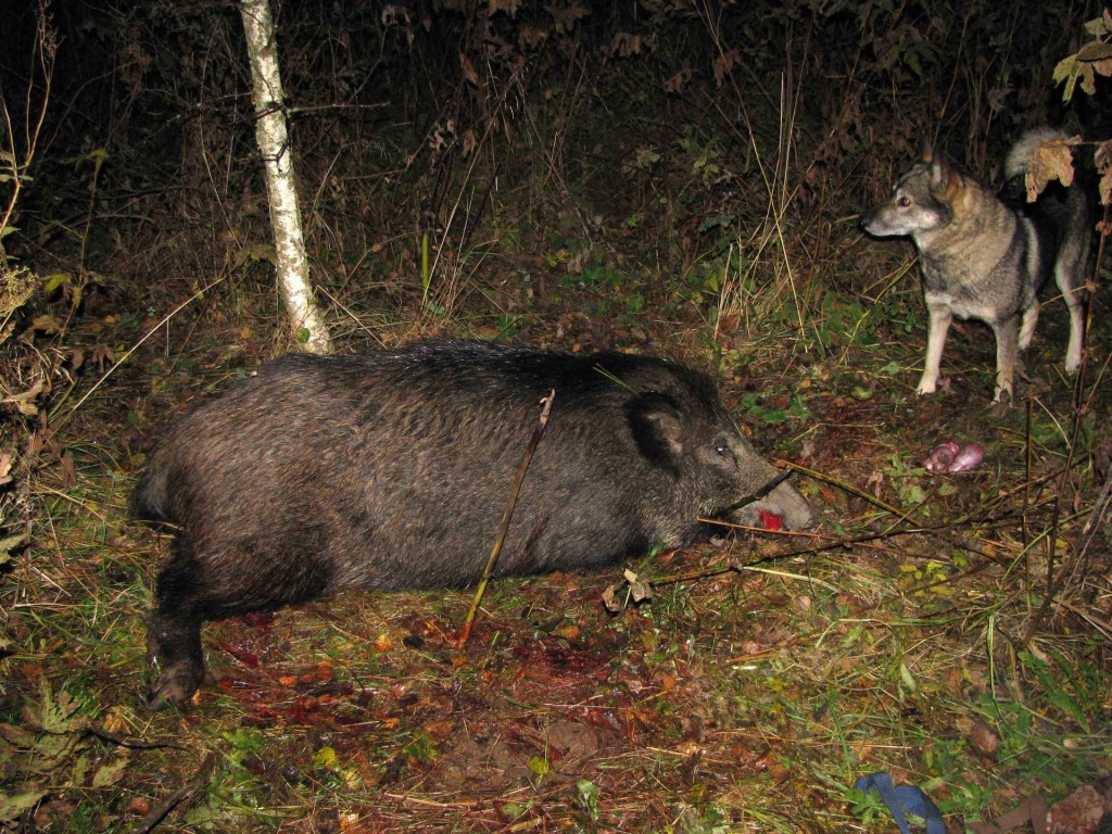 В 8-месячном возрасте его нужно подвести к добытому кабану, позволить тщательно обнюхать, полизать кровь и обязательно, как и другим собакам, дать кусочек мяса во время разделки. На этом этапе вы сможете оценить рабочие качества собаки. Если она сразу накинется на зверя и начнет рвать его щетину, значит, и по живому кабану будет работать хорошо. Если щенок опасается кабана, сами подведите его к животному и дайте его потрепать. В этот момент у нее должны загореться глаза от злобы и азарта. Если щенок так и остается боязливым, лучше сразу его переориентировать с кабана на других животных.