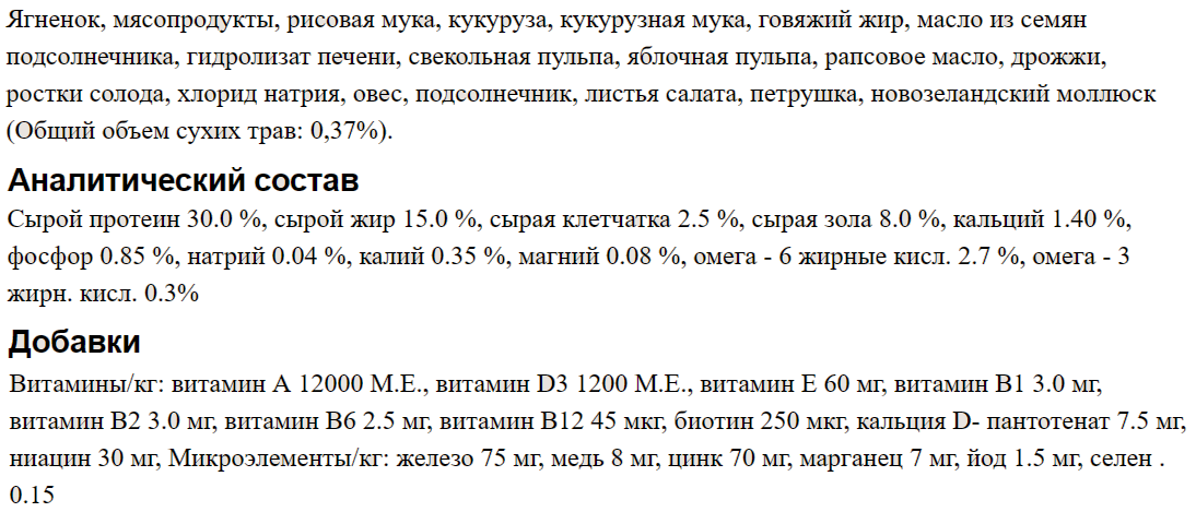 В состав также входят хондропротекторы для восстановления хрящевой ткани. Точно подобранное соотношение антиоксидантов и жирных кислот снимает воспаление и болевые ощущения. Содержание сырого жира и масел составляет 12%. Это обеспечивает блеск шерсти любимца. Также в состав входят экстракты трав, ягод. Они способствуют пищеварению и являются источником клетчатки, натуральных антиоксидантов и витаминов. Выпускается корм упаковками по 2 или 12 кг.