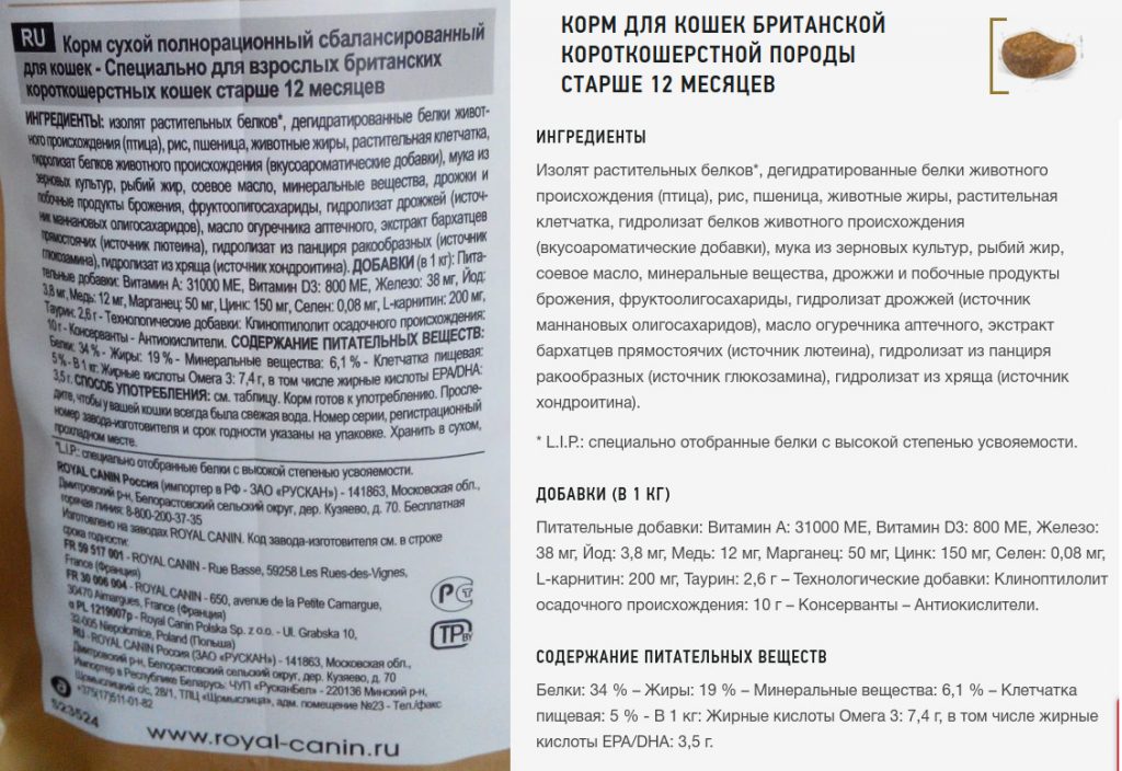 Ознакомимся с составом корма Royal Canin на примере варианта Adult British Shorthair (для взрослых кошек британской короткошерстной породы). Посмотреть его можно на изображении ниже, рекомендуем кликнуть изображения для увеличения: