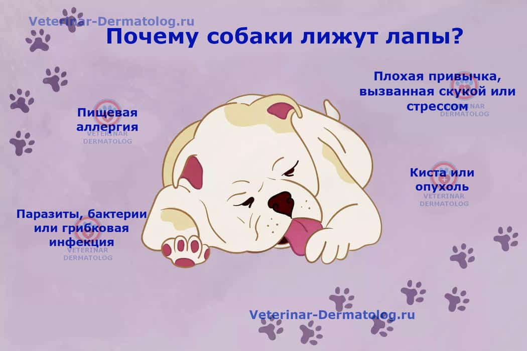 Инфекции тоже заставляют собак лизать лапы. У многих особей развиваются бактериальные или грибковые инфекции лап. Эти инфекции могут возникнуть по множеству причин. Однако иногда они являются вторичными по отношению к аллергии. Когда собака сильно облизывает свои лапы, они остаются влажными и более восприимчивы к бактериям и грибковым спорам. ЕВнешние паразитарные инфекции, такие как блохи или чесотка, также могут вызывать зуд в лапах, что приводит к чрезмерному лизанию.