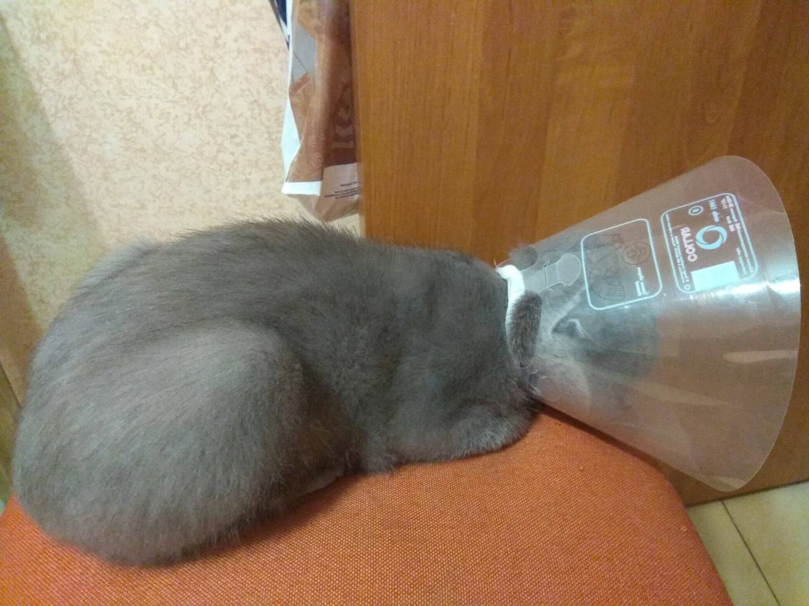 Как только вы заметили, что ваш прооперированный питомец начал регулярно «слюнявить» область мошонки, немедленно (!) идите к ветеринару и просите хирургический («Елизаветинский») воротник. Это устройство, напоминающее воронку, надевают на шею коту. Снимают его только для приема пищи. Время носки – не менее недели (но лучше – 14 дней).