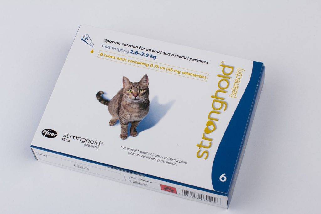 Капли на холку для кошек стронгхолд выпускаются в США, оказывают комплексное действие при уничтожении паразитов. Часто используются в профилактических мерах. Основное действующее вещество селамектин, который убивает внутренних и внешних паразитов. Препарат не рекомендуется котятам, которым не исполнилось два месяца. Препарат влагоустойчивый, попадание воды на холку не снижает его эффективность. Кроме этого, стронгхолд обладает глистогонным действием.