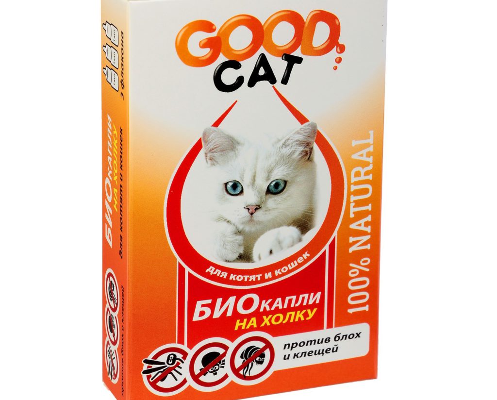 Средство производится в России. Активным веществом является растительный компонент гераниол – ненасыщенный спирт, который входит в состав многих эфирных масел. Он является сильным репеллентом, отпугивает многих кровососущих насекомых, но привлекает пчел. Натуральная основа делает «Good cat» одним из самых безопасных препаратов против блох, однако эффективность его ниже, чем у других. Капли рекомендуются для применения у котят с 4 недель. Средняя стоимость упаковки, содержащей 3 флакона, составляет 120 руб.