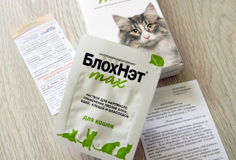 Средство производится в России. Действующие компоненты: инсектицид фипронил, противопаразитарное вещество бензилбензоат, диэтилтолуамид (обладает инсектицидным и репеллентным действием), ювемон. «БлохНэт max» действует долго – после попадания на кожу активные вещества высвобождаются медленно, обеспечивая продолжительную защиту: от блох – до 8 недель, от клещей и власоедов – до 4, от комаров – до 1 недели. 1 мл средства обойдется в среднем в 100 руб.