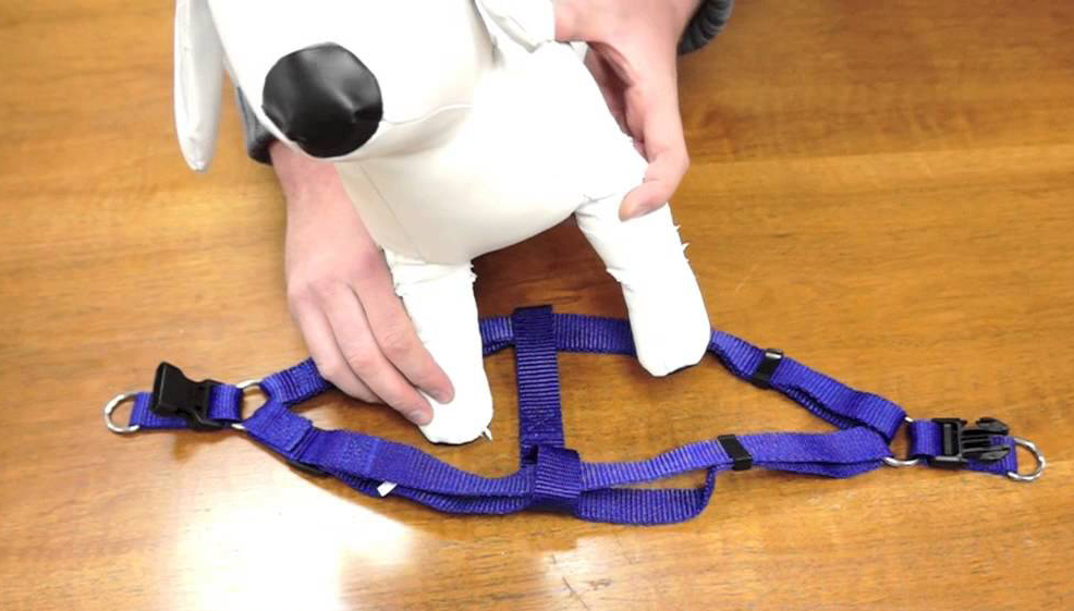 - Располагаем перемычку внизу и просовываем лапу животного в треугольник, образованный перемычкой и шейным и грудным ремешками.