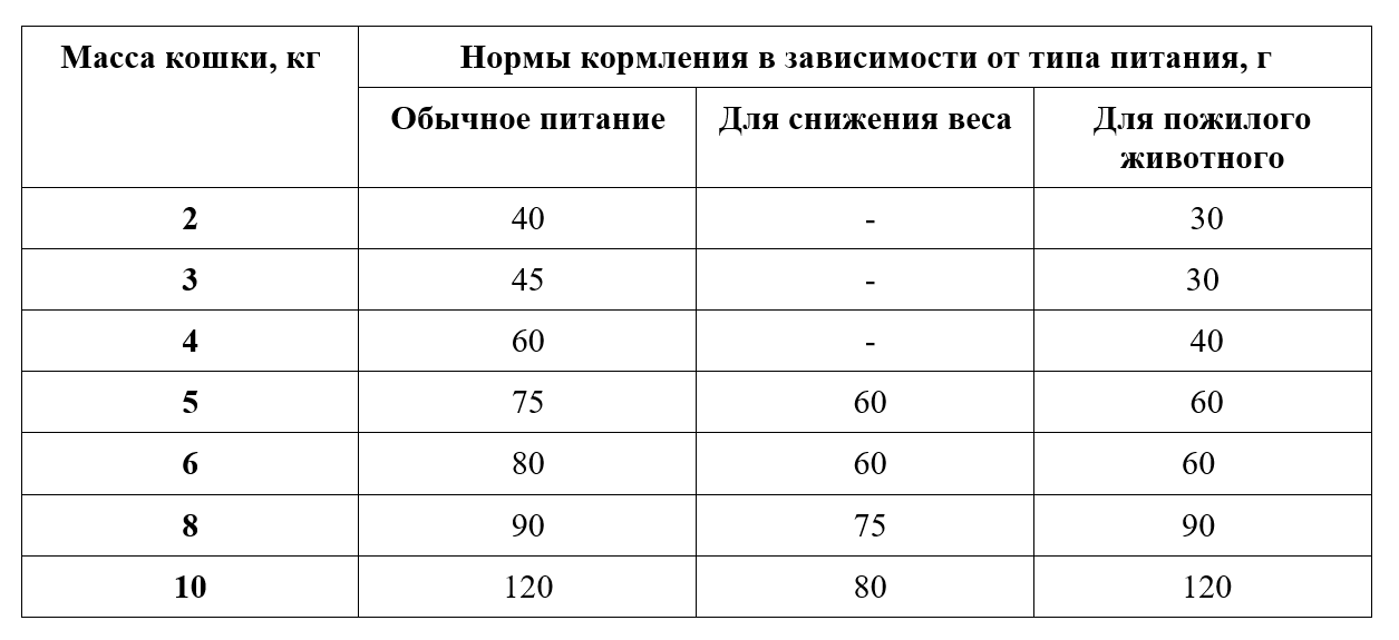 Для кастрированных котов ежедневная норма корма должна быть немного меньше указанной в таблице. Ведь стерилизованные и кастрированные коты быстрее полнеют.