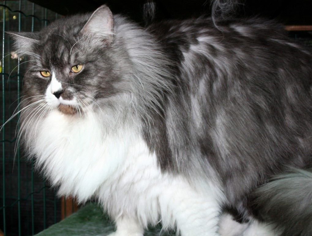 У нее также длинная шерсть, крепкое тело, большие глаза, широко расставленные уши, на концах которых могут быть маленькие кисточки. На груди присутствует шикарный воротник, а на лапах – штанишки из шерсти, за счет чего кошки выглядят просто роскошно. Шерсть очень мягкая и приятная на ощупь. Хвост, как правило, длинный и пушистый. У черных животных глаза обычно зеленого или желтого цвета.
