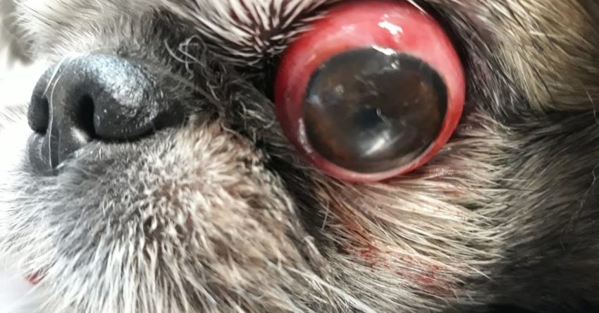 Второе название – экзофтальм. При этом, чаще генетическом наследственном заболевании, смещается глаз за пределы орбитальной кости. Даже при незначительном выпячивании яблока за пределы области ресниц, ветеринар поставит этот диагноз. Травматический экзофтальм может приводить не только к выходу за орбиту, но и выпадению глаза у собаки.
