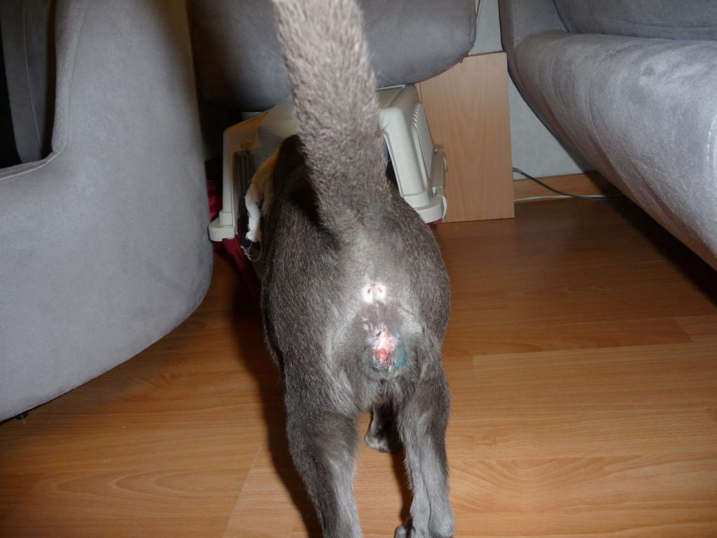 В течение 4-6 суток нужно обрабатывать место хирургического вмешательства при помощи зеленки, Хлоргексидина или другого антисептика, который посоветует ветеринар. Коты, как правило, вылизывают свои ранки самостоятельно. Но в данном случае это не совсем желательно. Чтобы избежать этого, можно воспользоваться специальным воротником, который снимается только во время приема пищи. Животное может начать тереть рану о поверхность пола или предметы мебели. Это крайне нежелательно и может быть опасно в первые несколько дней. Во избежание этого, необходимо воспользоваться подгузником, предварительно вырезав в нем дырочку для хвостика. Это убережет место оперативного вмешательства от расчесывания и инфицирования.