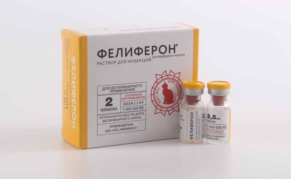 | Фелиферон | Интерферон кошачий, уксусная кислота ледяная, натрия ацетат, натрия хлорид, полисорбат, натриевая соль ЭДТА, декстран, вода для инъекций. | Раствор для инъекций во флаконах по 2,5 мл. В упаковке может быть 1, 2 или 5 флаконов. | Внутримышечно. | Фелиферон – раствор с противовирусным действием. Уколы назначают при лечении вирусных патологий желудочно-кишечного тракта, респираторных болезней, а также инфекций смешанной этиологии у животных. При высоком риске заражения инъекции делают для профилактики. Допускается сочетание препарата с антибактериальными, иммуномодулирующими и сывороточными средствами. | Стоимость упаковки зависит от количества флаконов, поэтому составляет от 400 до 1400 руб. |