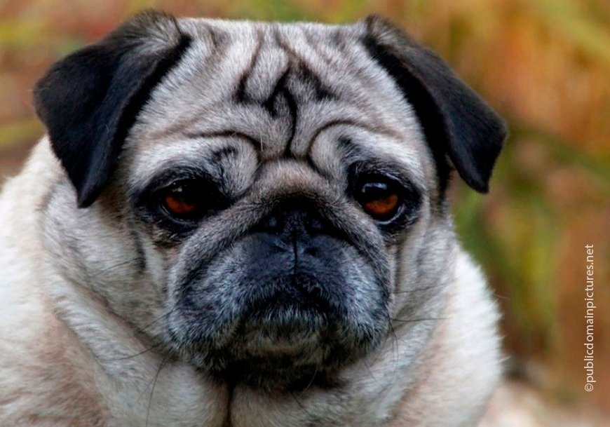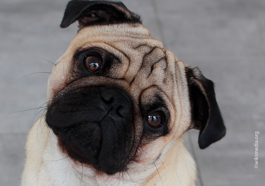 Мопсы обладают крупной, квадратной головой. Голова сук меньше, чем у кобелей. Верхняя часть черепа (если смотреть на нее сверху) должна быть плоской между ушей. С бокового вида лоб плоский. Если у собаки округлые очертания – это повод для дисквалификации. На лбу должны присутствовать заметные складочки с достаточной глубиной. Нижняя челюсть обладает достаточной шириной с выделяющимся подбородком.