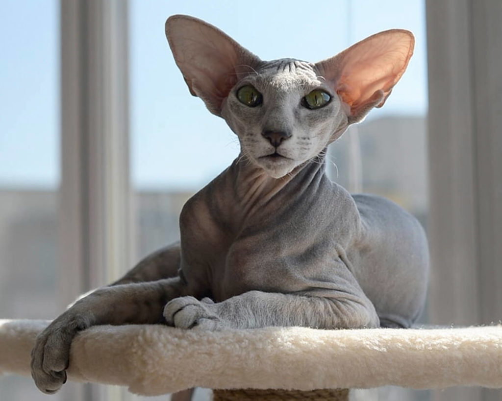 - Петерболд – результат скрещивания донского сфинкса и ориентальной породы. Для него характерно отсутствие какой-либо растительности. Животное проявило себя как спокойное, адекватное, дружелюбное и без проблем находящее общий язык с людьми, в том числе и с детьми.