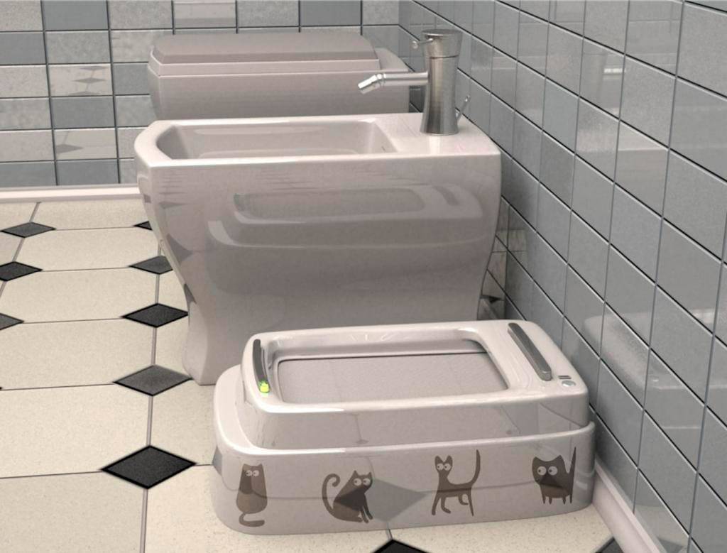 Выглядит как уменьшенная копия унитаза. После того, как кот сходил на горшок, сенсоры фиксируют факт ухода питомца, и подается напор воды, смывающий нечистоты.