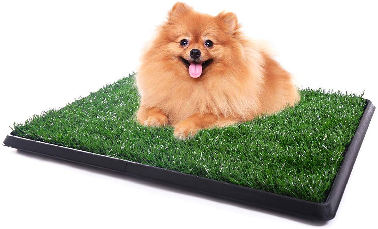 - Лоток с газонной травкой. Довольно оригинальный многоуровневый туалет для собак. Внизу находится вместительный поддон. Средний уровень выполняет защитную функцию от контактирования с настилом. Верхний слой – имитация газона. Жидкость протекает сквозь травянистый слой и задерживается в контейнере. Лоток очень объемный, так что убирать за питомцем можно лишь раз в 6-7 дней. Не стоит бояться неприятного аромата, так как в изготовлении данного туалета применяется технология «запирания» запаха. Удобно использовать лоток с газоном дома, на улице, он вполне транспортабелен. Его большая вместимость решает вопрос с отъездом на несколько дней, если появляется необходимость оставить любимца дома. Туалет адаптирован к любым температурным перепадам, прост в эксплуатации и уборке.