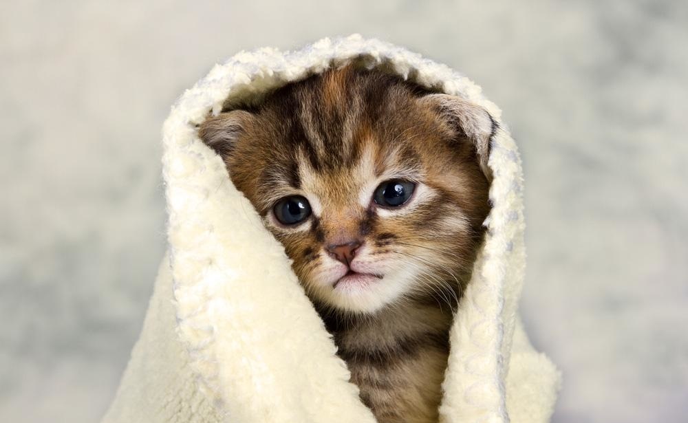 Осторожно возьмите котёнка на руки, фиксируя его таким образом, чтобы он не царапался и не крутился. Хорошо, если с удержанием питомца вам поможет другой человек.