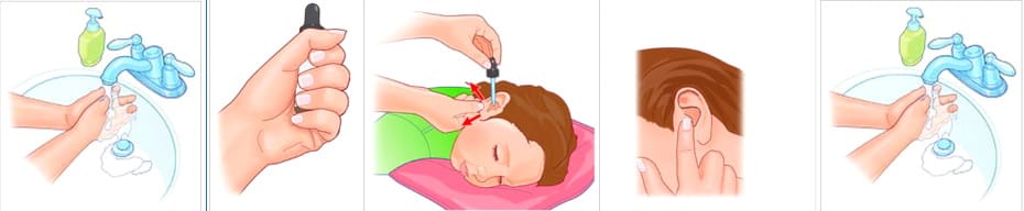 - Несколько капель жидкости (3-5) закапывается в ушко.