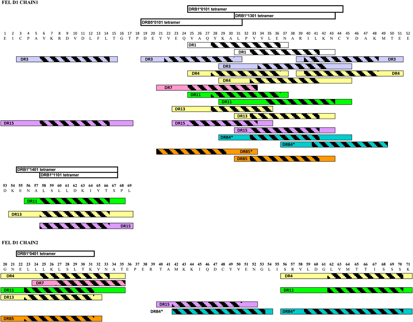 - Изначально были выявлены те эпитопы кошачьего аллергена (Fel d1), которые связывались с молекулами главного комплекса гистосовместимости II (десятью самыми распространёнными HLA-DR рецепторами) на поверхности АПК и вызывали реакцию Т-лимфоцитов (рис. 2).