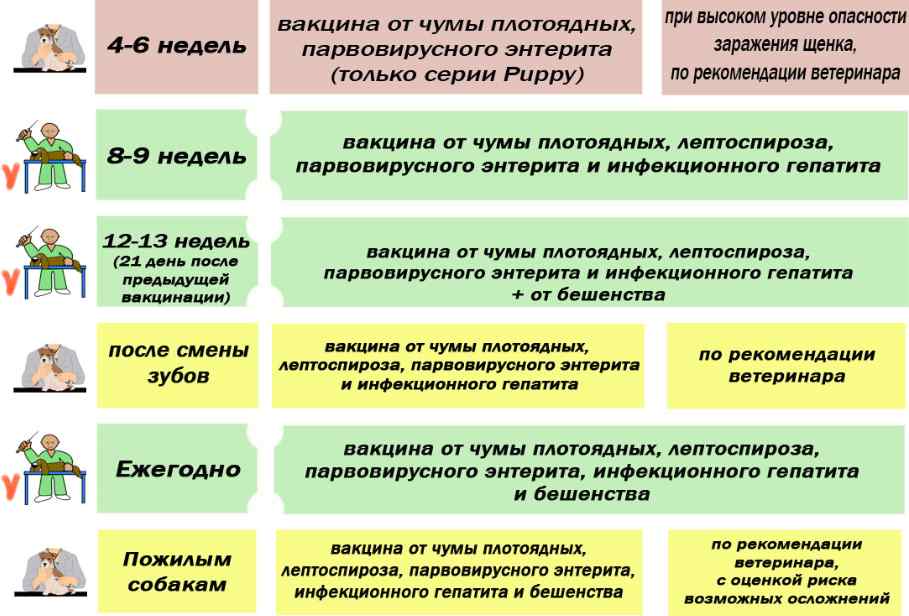 Имейте в виду, что возможны различные расхождения с представленным графиком. Ветеринар оценивает общее состояние питомца и только после этого делает вывод о том, какие вакцины и в какое время вводить животному. Ветеринар же дает рекомендации касательно конкретного производителя, препараты которого надлежит приобрести. Не советуем проявлять инициативу и искать лекарство своими силами, поскольку оно может отрицательно сказаться на самочувствии собаки.
