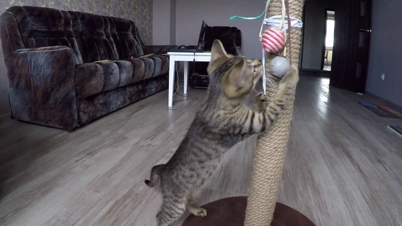 Неоценимую помощь в приучении к когтеточке оказывают различные игрушки. Можно самостоятельно прикрепить игрушку к столбику или дощечке при помощи веревки.