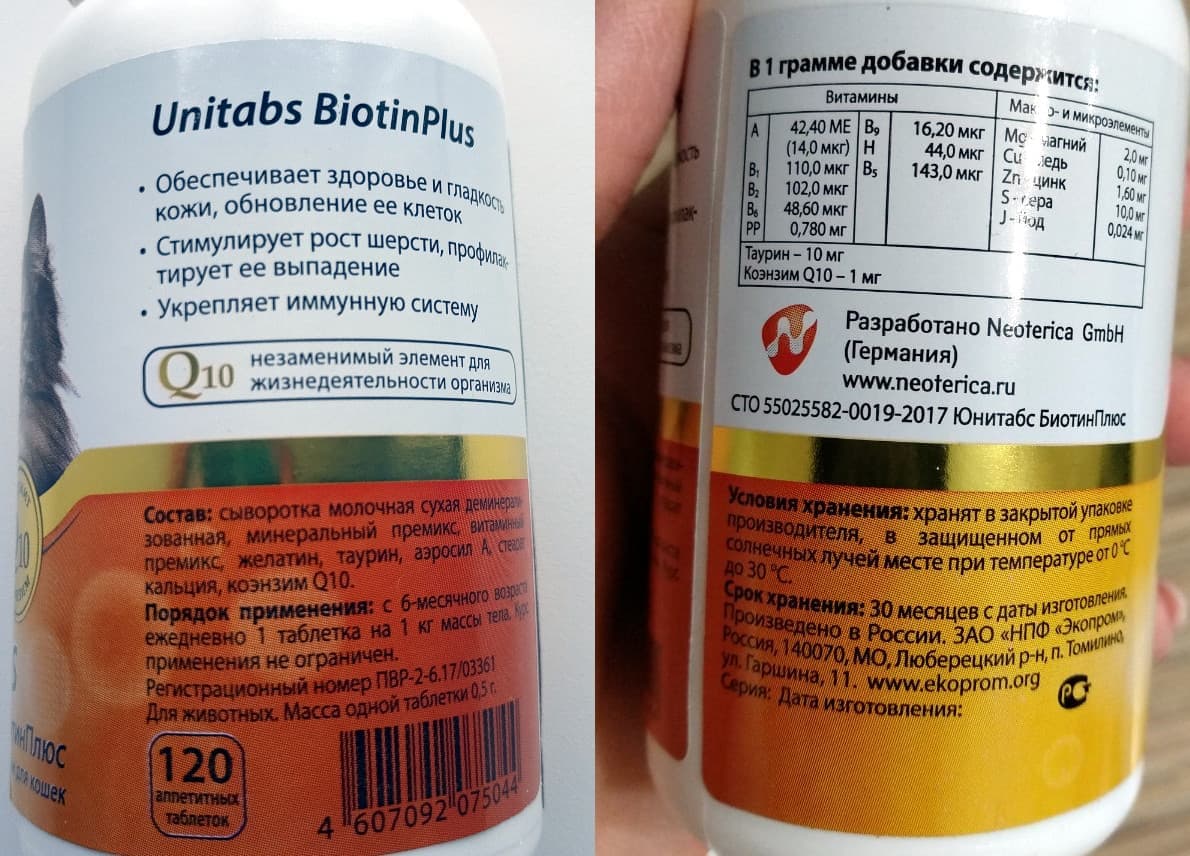 - BiotinPlus — применяют кошкам с 6-месячного возраста при сухости, неэластичности и шелушении кожи, интенсивном выпадении шерсти, её ломкости и сухости, отсутствии у неё густоты и блеска.