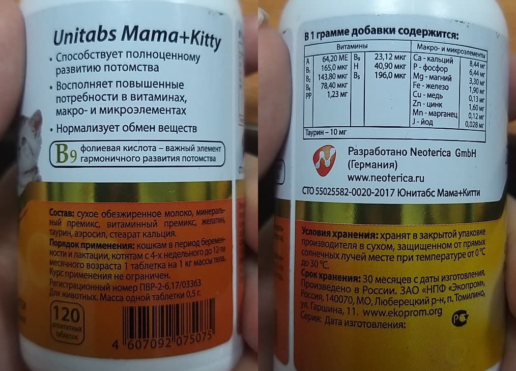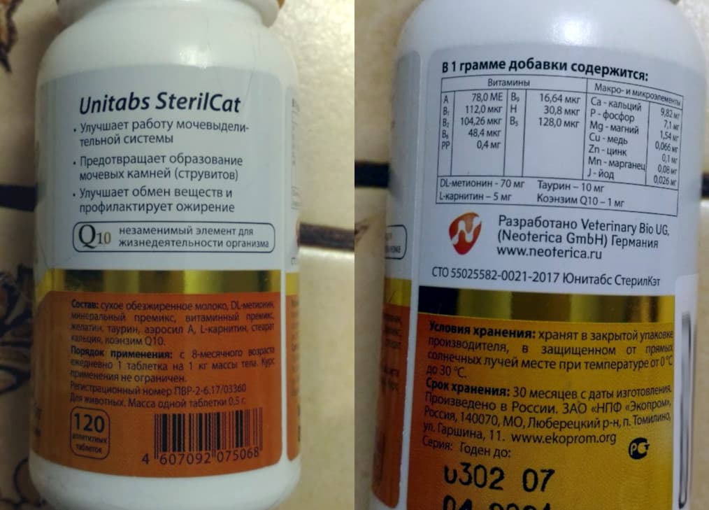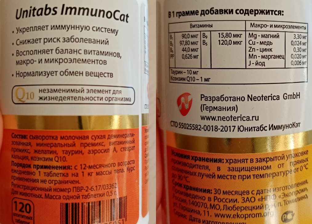 У всей серии добавок «Юнитабс» состав схожий, но содержание витаминов и минералов в «витаминном» и «минеральном» премиксах отличаются.