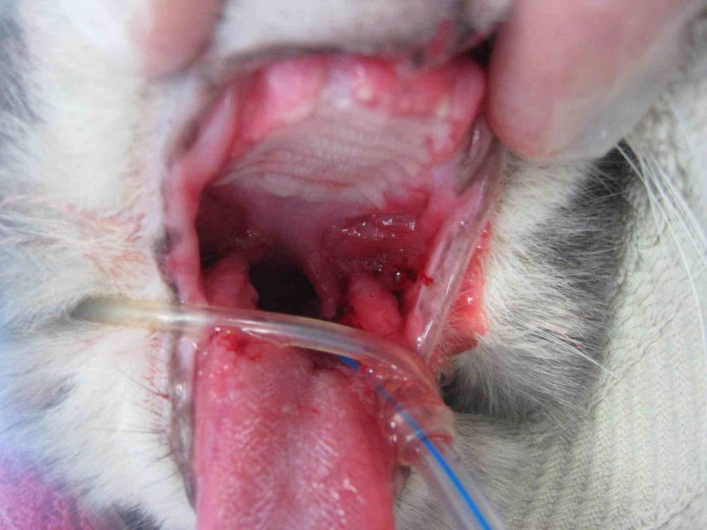 Такая онкология поражает ротовую полость кошки, может затронуть язык, нёбо, миндалины. При этом на слизистой образуются незаживающие язвы, появляется сильный и неприятный запах. По мере прогрессирования заболевания у питомца могут выпадать зубы, искривляются челюсти.