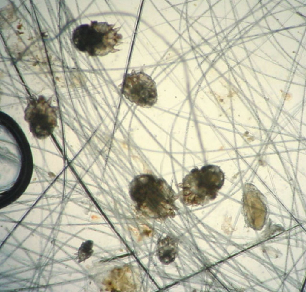 - среди волосков заметны черные точки – это экскременты паразитов;
