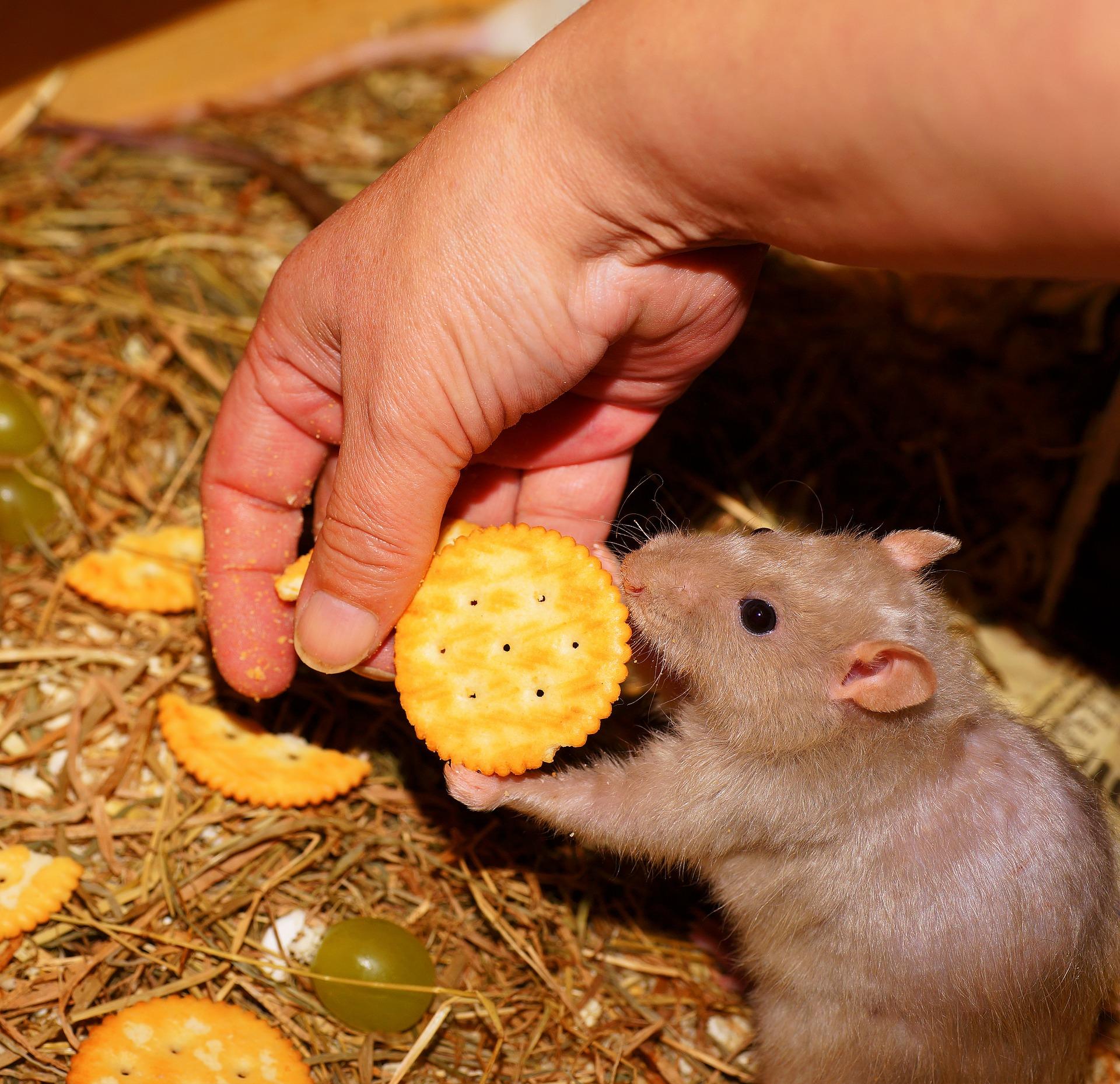 Если вы хотите поощрить своего питомца, предложите крыске кусочек яблока, банана, груши, сливы, персика, винограда или черешни. Изредка можно давать сухофрукты, финики, изюм. Взрослых особей кормят 1-2 раза в день, а малышей 3-4 раза. Нельзя предлагать грызунам жирные и жареные продукты, сырой картофель, бобовые культуры, артишоки, шоколад, капусту.