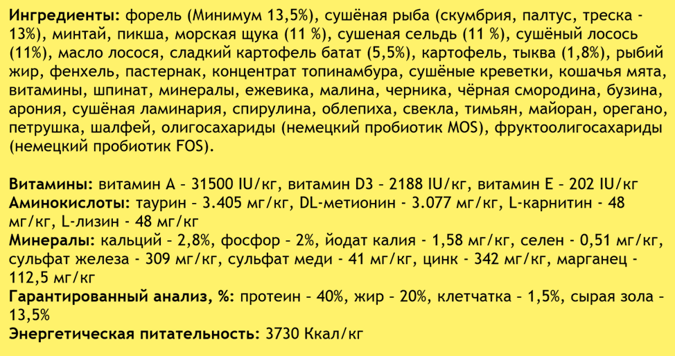 Производитель подготовил для питомца океанический коктейль из нескольких видов рыб и креветок. В сумме животные компоненты составляют 79% массы корма. Незаменимые омега-3 кислоты поступают из лососевого масла. В рецептуре не используют зерновые корма. Углеводы поступают преимущественно, из картофеля. Батат, помимо крахмала, содержит сахара. Он стимулирует работу почек, печени, профилактирует развитие опухолей и имеет противовирусную активность.
