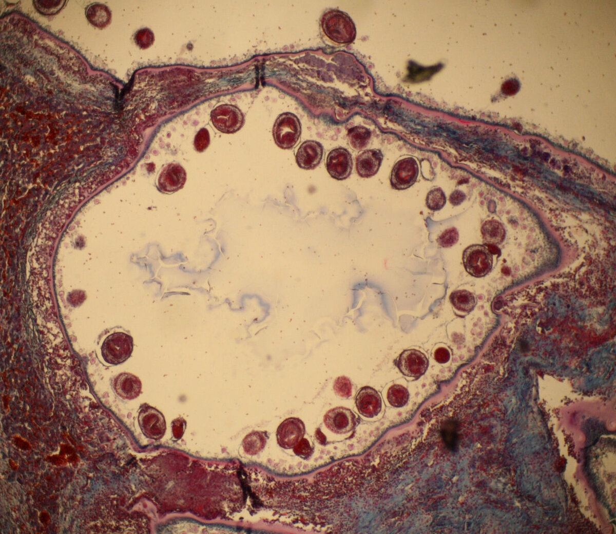 Киста может лопнуть и освободить еще десятки личинок. Вырастая, эхинококковая киста отодвигает и сдавливает ткани хозяина, которые впоследствии атрофируются и погибают.